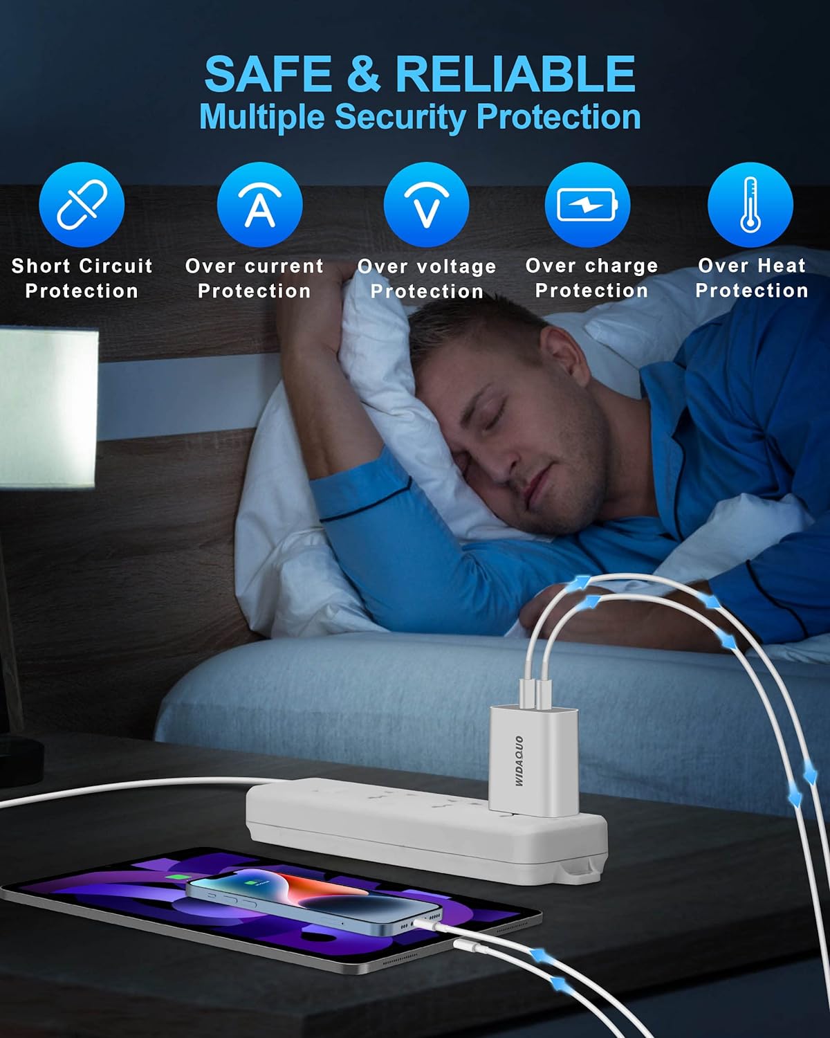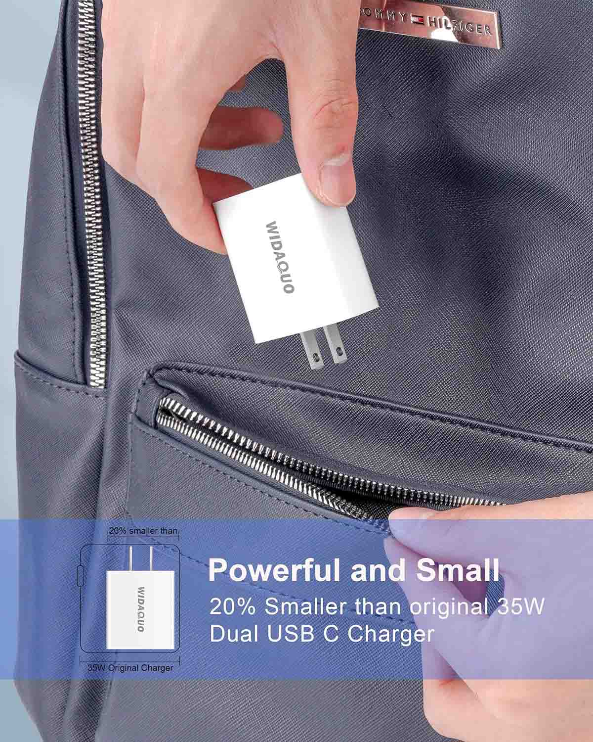 【Dual Port USB C Charger】 40W USB C wall charger with 20W dual USB-C port (20W+20W), each port independent provide 20W power output. This means that you can fast charge for iPhone and iPad simultaneously. 【3X Faster Charging】 40W USB C Power Adapter with Upgrade PD 3.0 technology can fast charge for iPhone 15 14 13 12 11 up to 50% in just 30 minutes, only takes 1.8 hours to charge your Phone fully, save more than one hour for you, 3X faster than original 5W charger. 【Widely Compatibility】 Designed for iPhone 15 14/13/13/11 and iPad Pro. The USB C block compatible with iPhone 15/15 Plus/15 Pro/15 Pro Max, iPhone 14/13/12/11/SE/XS/XR/X Series, New iPad Pro/iPad Air/iPad Mini, Airpods Pro, Samsung Galaxy S23/S22/S21/S20, Note 20/10/9, Google Pixel 7/6/5/4/3 Series, and more USB C devices. 【Safe & Reliable】 Type C fast charger bulit-in multi-protection system, avoiding from over-voltage, over-charge, over-heating, etc. Upgraded smart chip automatically match the current required by the device, ensure charge your device fast, safely and steadily. 【What You Get】 2-Pack 40W Dual Port USB C Charger Block, 2-Years replacement.