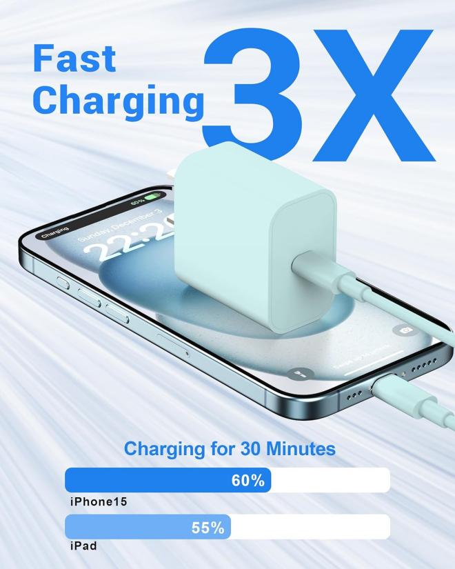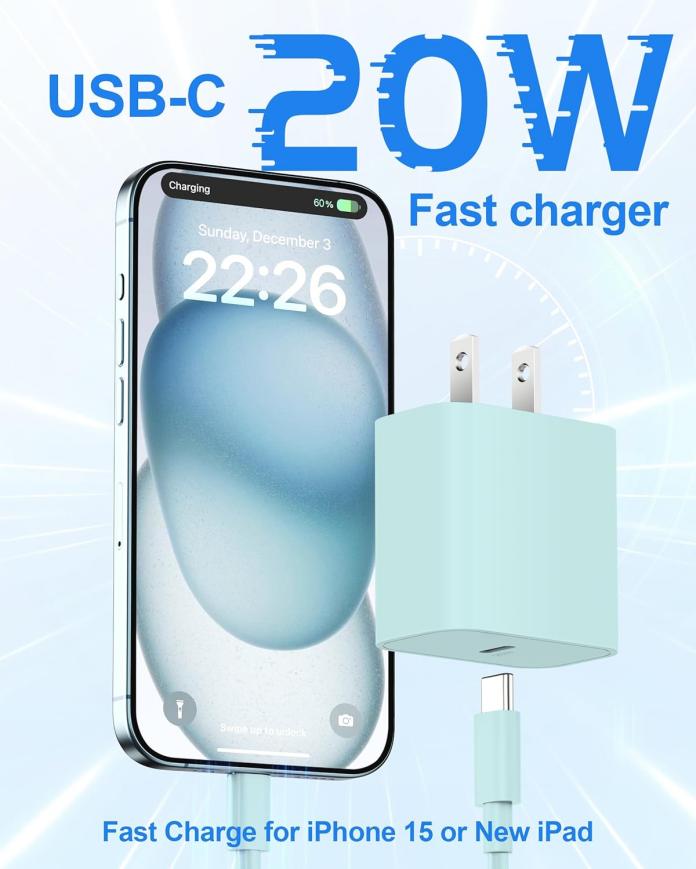 【USB C Fast Charger 】 With the 20W PD USB C Charger Block and 10FT long USB C to C cable, which can reach up to 3X faster than the standard 5W charger. You can charge for iPhone 15 from 0%-60% in about 30-Minis. 【Universal Compatibility】 20W USB C Fast Charger Compatible with most USB-C devices, including for iPhone 15/15 Plus/Pro Max, iPad Pro 12.9 inch 6th/5th/4th/3th (2022/2021/2020/2018), iPad Pro 11 inch 4th/3th/2th/1th (2022/2021/2020/2018), iPad Air 5th (2022), iPad Air 4th (2020), iPad Mini 6th Gen (2021), iPad 10th Generation 10.9 inch (2022); Also compatible with Google Pixel 7/6/5/4/3/2/XL, and more USB C android phones. 【60W 10FT USB C Cable】 USB-C to USB-C Charging Cable supports PD 3.0 fast charging speed max up to 20V/3A (60W), also support 480Mbps Sync/Data transfer speed; and the 10-Foot length long enough to be convenient to charge your device in bedroom, sofa, office. 【Safe & Reliable】 The upgraded Type C fast charger kit built-in multiple protection systems to avoid over-voltage, over-charge, over-heating; The iPad air charger iPad mini charger can automatically match the current required by your devices to charge your devices quickly, safely and stably. 【What Your Get】 2-Pack 20W USB C Wall Charger Block Power Adapter and 2-Pack 10FT USB C Charger Cord (Green)