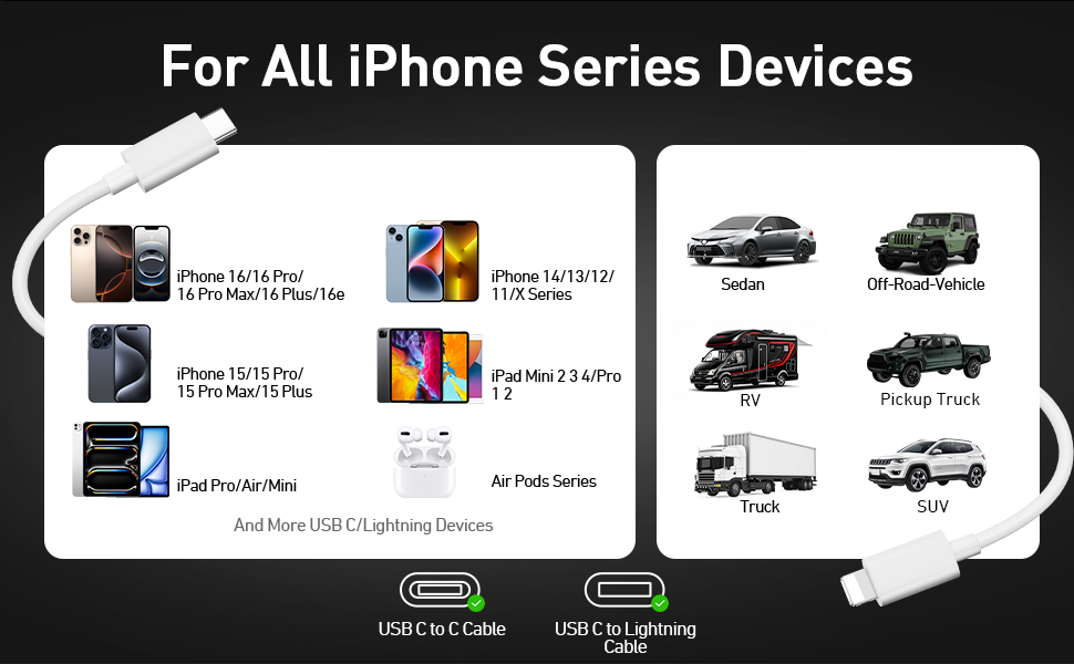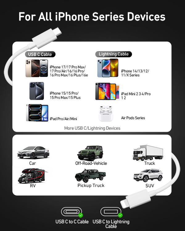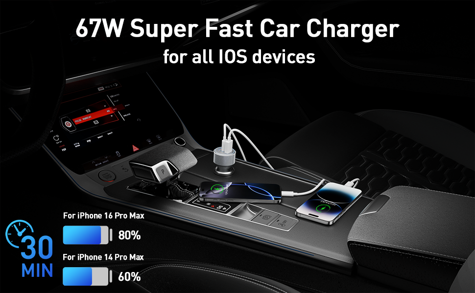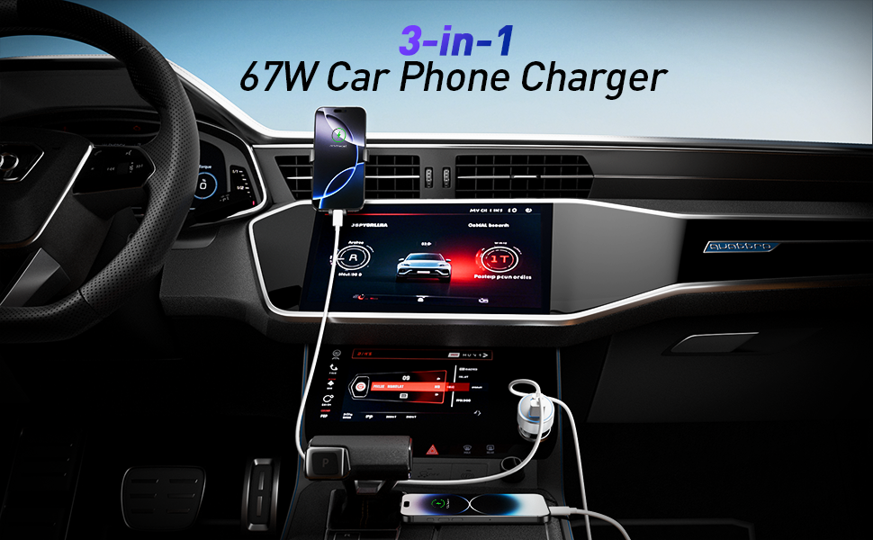 Manufacturer:Heyuan Renzhi Technology Co., Ltd. Model:C23XC-199 67W PD & QC Fast Charging: The 67W USB C car charger offers fast, efficient charging for all iPhone/Airpods series. Charge for your iPhone 17/16/15/14/13 series up to 80% and iPad up to 60% in just 30 minutes, 5X Fast charging speed 3-Port Simultaneous Charging: 67W car charger equipped with two USB-C ports and One USB A ports, support PD 37W Max (USB-C) and QC 30W Max (USB-A), can fast charge most of USB C and USB A devices simultaneously. One multiport car charger for all your Phones & Pads & USB Devices, the ideal companion for your travel Widely Compatibility: 67W USB C car charger with 3FT cables compatible with new or old iPhone, i Pad and Watch Models devices. Compatible with iPhone 17/17 Pro/17 Pro Max/Air/16/16 Plus/16 Pro/16 Pro Max/15/15 Plus/15 Pro/15 Pro Max/14//13/12/11/Pro Max/XS Max/XR/X/8/7 / 6 Plus/SE, iPad Pro 13/12.9/11 inch 6th/5th/4th/3rd, iPad Air 13/11 inch Air 6th/5th, iPad Mini A17 Pro 2025 7th/6th, iPad 11th A16 2025 10th Generation, AirPods Pro 3, MacBook, and more Safe Protections: The super fast car charger adapter built-in intelligent circuit design protects against short circuiting, protects devices from over-heating, over-current, over-charging and short circuits. 3 FT cables support 480Mbps sync data transfer speed. Blue LED ambient light makes it easy to find the charging ports in the dark What You Get: 2 x 67W 3-Port USB C Car Charger Adapter, 1 x 3FT USB C to C Cable, 1 x 3 FT USB C to Lightning Cable. 12-Month Replacement. If you have any issues, our professional and friendly customer service team will be keep online 24/7 and provide you with the suitable solutions