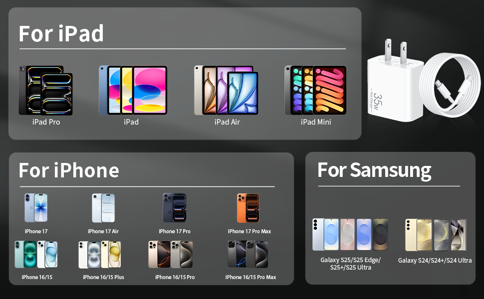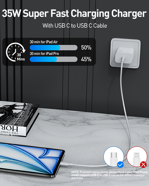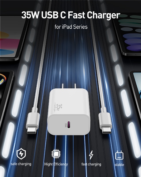 Manufacturer:Shenzhen Dipinle Technology Co., Ltd Model:CA-50T 35W iPad Charger Fast Charging: Experience the powerful functions of PD 3.0 super fast charging technology with this 35W iPad USB C charger block. Charge for your iPad 10th up to 60% and iPhone 17 up to 70% in just 30 minutes, 5X faster charging speed and save you over 1.5 hour 6FT iPad Type C Fast Charger Cord: The 6 foot USB-C to USB C charging cable enables you to charge for your iPad Pro device worry-free on the sofa, in the bedroom, in the office or on the go. Supports PD 3.0 fast charging up to 60W (3A/20V) and data sync transfer speed of 480Mbps Widely Compatibility: 35W Fast USB C fast charger specially designed for the iPad Series. Compatible with iPad Pro 13/12.9/11 inch 6th/5th/4th/3rd, iPad Air 13/11 inch M3 M2 Air 6th/5th, iPad Mini A17 Pro 2025 7th/6th, iPad 11th A16 2025 10th Generation, iPhone 17/17 Pro/17 Pro Max/Air/16/16 Plus/16 Pro/16 Pro Max/15/15 Pro/15 Pro Max, and also fast charge for Galaxy, Pixel, LG, Moto, Tablet, Android, and more USB-C devices. Note: This charger requires a USB-C to USB-C cable for connection. Please ensure your device has a USB-C port before purchase to avoid incompatibility. Safe Charging for iPad Pro: This 35W iPad Pro fast charger built-in smart IC chip that automatically identifies and matches the current required by the device to maximizing charging efficiency. Multiple protection systems to prevent over-charging and over-heating, ensuring the safety of connected devices. Note: This charger requires a USB-C to USB-C cable for connection. Please ensure your device has a USB-C port before purchase to avoid incompatibility. What You Get: 1 x 35W Fast USB C wall charger Block, 1 x 6FT USB C to USB C Cable. If you have any issues, our professional and friendly customer service team will be keep online 24/7 and provide you with the suitable solutions