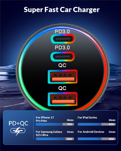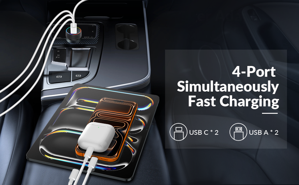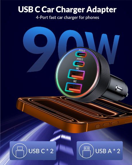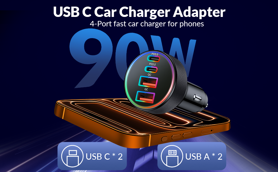 [4 in 1] 4-Port Car Charger for iPhone 17 16 15: 90W Car charger adapter equipped with 2 USB-C ports and 2 USB-A ports, support PD 45W Max (USB-C) and QC 45W Max (USB-A) output, it can fast charge most of USB C and USB A devices simultaneously. One multiport car cigarette lighter adapter for all your Phones & Tablets & USB Devices, travel essentials for men women 90W Fast Charging for iPhone 17/16/15: Car phone charger with [2025] upgraded PD/PPS/QC fast charging technology, 90W Power charging for iPhone/iPad/Mac Book/Android Devices. Charge for iPhone 17/16/15 up to 70% and iPad series up to 60% in just 30 minutes. And charge for Galaxy S25/S24 series up to 80% and most Android devices up to 60% in 35 minutes Widely Compatibility: [4 in 1] 90W Multiport Fast Car charger compatible with iPhone 17/17 Pro/17 Pro Max/Air/16e/16/15 /14/13/12/Pro Max/11/XS/XR/X, iPad Pro/Air/Mini, Mac Book Pro/Air 2025/2024/2023/2022/2020/2018, AirPods Pro 3 2, AirPods 4/Max, Samsung Galaxy S25/S24/S23/S22/S21/S20/Ultra, Note 20/10/9/8, Google Pixel 10/9/8/7/6/5/4/3 XL, LG, Moto, Tablet, Laptop, Android Phones, Driving Recorder and more Safe and Reliable: The Type C car charger adapter built-in multi-functional safety protection system to prevent form over-heating, over-charging, over-current and short circuit, when the power is full, it will automatically stop charging to protect the safety of your connected device What You Get: 1 x 90W 4-Port USB C Car Charger Cigarette Lighter Adapter. 12V-24V USB Outlet Type C Car Accessories Cargador Carro Lighter Adapter Compatible with Cars, Trucks, SUVs, Pickup, MPV, Jeep Wrangler, Off-road Vehicle, NEVs, etc