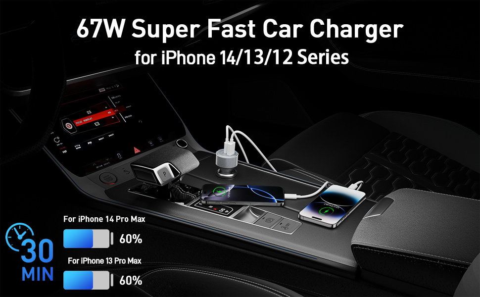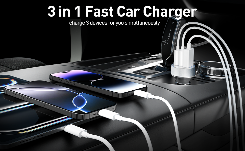 67W Super Fast Charging: iPhone car charger with the all-new upgraded PD fast charging technology of max 67W output, and charge for your iPhone 14/13/12 series up to 70% and charge your iPad up to 60% in just 30 minutes, help you work efficiently. Compatible with 12-24V Car USB outlet 3-Port Simultaneous Charging: 67W car charger equipped with two USB-C ports and One USB A ports, support PD 37W Max (USB-C) and QC 30W Max (USB-A), can fast charge most of USB C and USB A devices simultaneously. One multiport car charger for all your Phones & Pads & USB Devices, the ideal companion for your travel Widely Compatibility: 67W USB C fast car charger power adapter with 3FT iPhone charger cord to access fast charging for iPhone 14/14 Plus/14 Pro/14 Pro Max/13/13 Mini/13 Pro/13 Pro Max/12/12 Pro/12 Pro Max/11/11 Pro Max/XS/XR/X/8/7/6/6S Plus/SE, iPad, AirPods and more Safe and Reliable: The cigarette lighter adapter built-in multi-functional safety protection system to prevent form over-heating, over-charging, over-current and short circuit, when the power is full, car iPhone charger will automatically stop charging to protect the safety of your connected device What You Get: 1 x 67W 3-Port Type C Car Charger, 1 x USB C to Lightning Cable. 24/7 Friendly Customer Service. USB C Car Accessories Adapter for iPhone USB C Car Charger Fast Charging, Travel Essentials Gifts for Women Men for iPhone 14 13 12