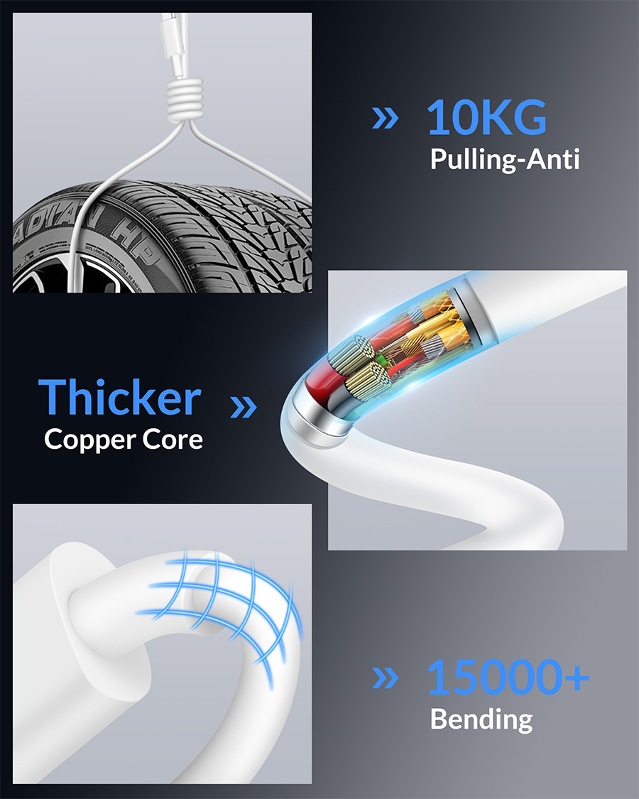USB C charging cable made of high-quality aluminum alloy connectors and premium TPE materials, which is more flexible and durable, can withstand more than 15,000 bending tests without tangling