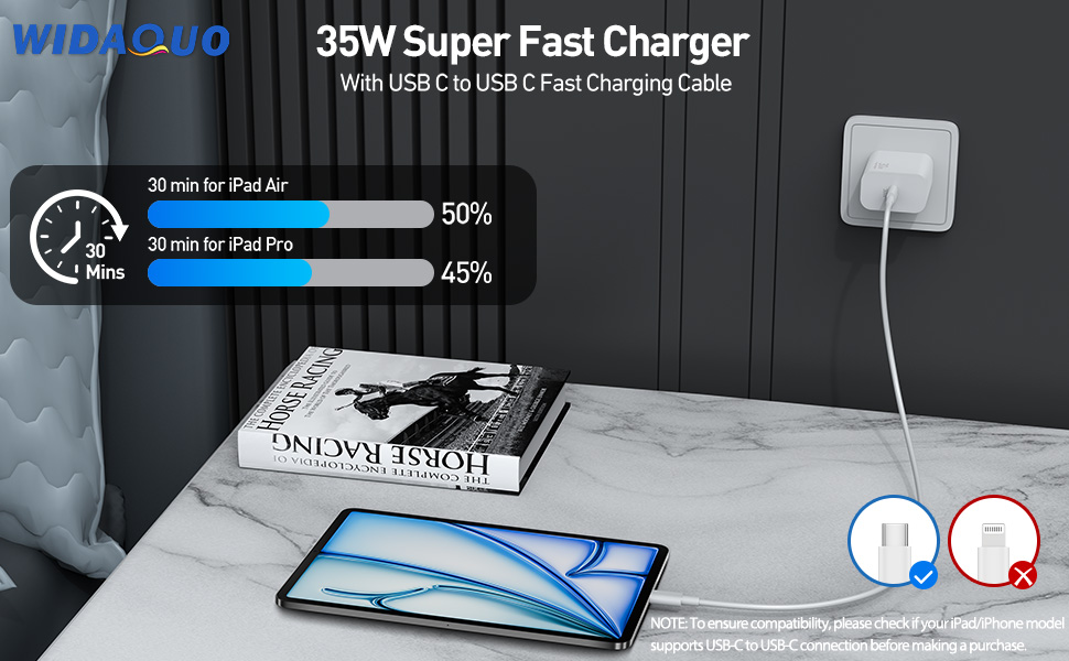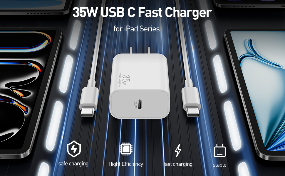 35W iPad Charger Fast Charging: Experience the powerful functions of PD 3.0 super fast charging technology with this 35W iPad USB C charger block. Charge for your iPad 10th up to 60% and iPhone 17 up to 70% in just 30 minutes, 5X faster charging speed and save you over 1.5 hour 10FT Long iPad Type C Fast Charger Cord: The 10 foot extra long USB-C to USB C charging cable enables you to charge for your iPad Pro device worry-free on the sofa, in the bedroom, in the office or on the go. Supports PD 3.0 fast charging up to 60W (3A/20V) and data sync transfer speed of 480Mbps Widely Compatibility: 35W Fast USB C fast charger specially designed for the iPad Series. Compatible with iPad Pro 13/12.9/11 inch 6th/5th/4th/3rd, iPad Air 13/11 inch M3 M2 Air 6th/5th, iPad Mini A17 Pro 2025 7th/6th, iPad 11th A16 2025 10th Generation, iPhone 17/17 Pro/17 Pro Max/Air/16/16 Plus/16 Pro/16 Pro Max/15/15 Pro/15 Pro Max, and also fast charge for Galaxy, Pixel, LG, Moto, Tablet, Android, and more USB-C devices. Note: This charger requires a USB-C to USB-C cable for connection. Please ensure your device has a USB-C port before purchase to avoid incompatibility. Safe Charging for iPad Pro: This 35W iPad Pro fast charger built-in smart IC chip that automatically identifies and matches the current required by the device to maximizing charging efficiency. Multiple protection systems to prevent over-charging and over-heating, ensuring the safety of connected devices What You Get: 1 x 35W Fast USB C wall charger Block, 1 x 10FT USB C to USB C Cable. If you have any issues, our professional and friendly customer service team will be keep online 24/7 and provide you with the suitable solutions