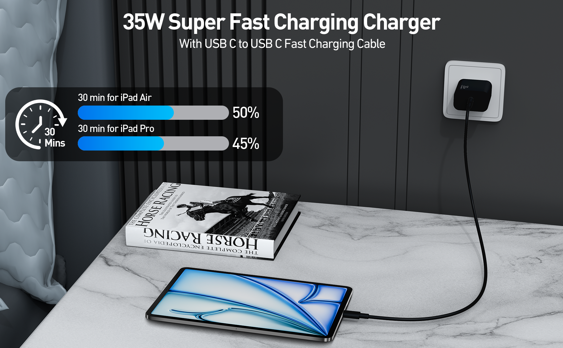 35W iPad Charger Fast Charging: Experience the powerful functions of PD 3.0 super fast charging technology with this 35W iPad USB C charger block. Charge for your iPad 10th up to 60% and iPhone 17 up to 70% in just 30 minutes, 5X faster charging speed and save you over 1.5 hour 3FT iPad Type C Fast Charger Cord: The 3 foot USB-C to USB C charging cable enables you to charge for your iPad Pro device worry-free on the sofa, in the bedroom, in the office or on the go. Supports PD 3.0 fast charging up to 60W (3A/20V) and data sync transfer speed of 480Mbps Widely Compatibility: 35W Fast USB C fast charger specially designed for the iPad Series. Compatible with iPad Pro 13/12.9/11 inch 6th/5th/4th/3rd, iPad Air 13/11 inch M3 M2 Air 6th/5th, iPad Mini A17 Pro 2025 7th/6th, iPad 11th A16 2025 10th Generation, iPhone 17/17 Pro/17 Pro Max/Air/16/16 Plus/16 Pro/16 Pro Max/15/15 Pro/15 Pro Max, and also fast charge for Galaxy, Pixel, LG, Moto, Tablet, Android, and more USB-C devices. Note: This charger requires a USB-C to USB-C cable for connection. Please ensure your device has a USB-C port before purchase to avoid incompatibility. Safe Charging for iPad Pro: This 35W iPad Pro fast charger built-in smart IC chip that automatically identifies and matches the current required by the device to maximizing charging efficiency. Multiple protection systems to prevent over-charging and over-heating, ensuring the safety of connected devices What You Get: 1 x 35W Fast USB C wall charger Block, 1 x 3FT USB C to USB C Cable. If you have any issues, our professional and friendly customer service team will be keep online 24/7 and provide you with the suitable solutions