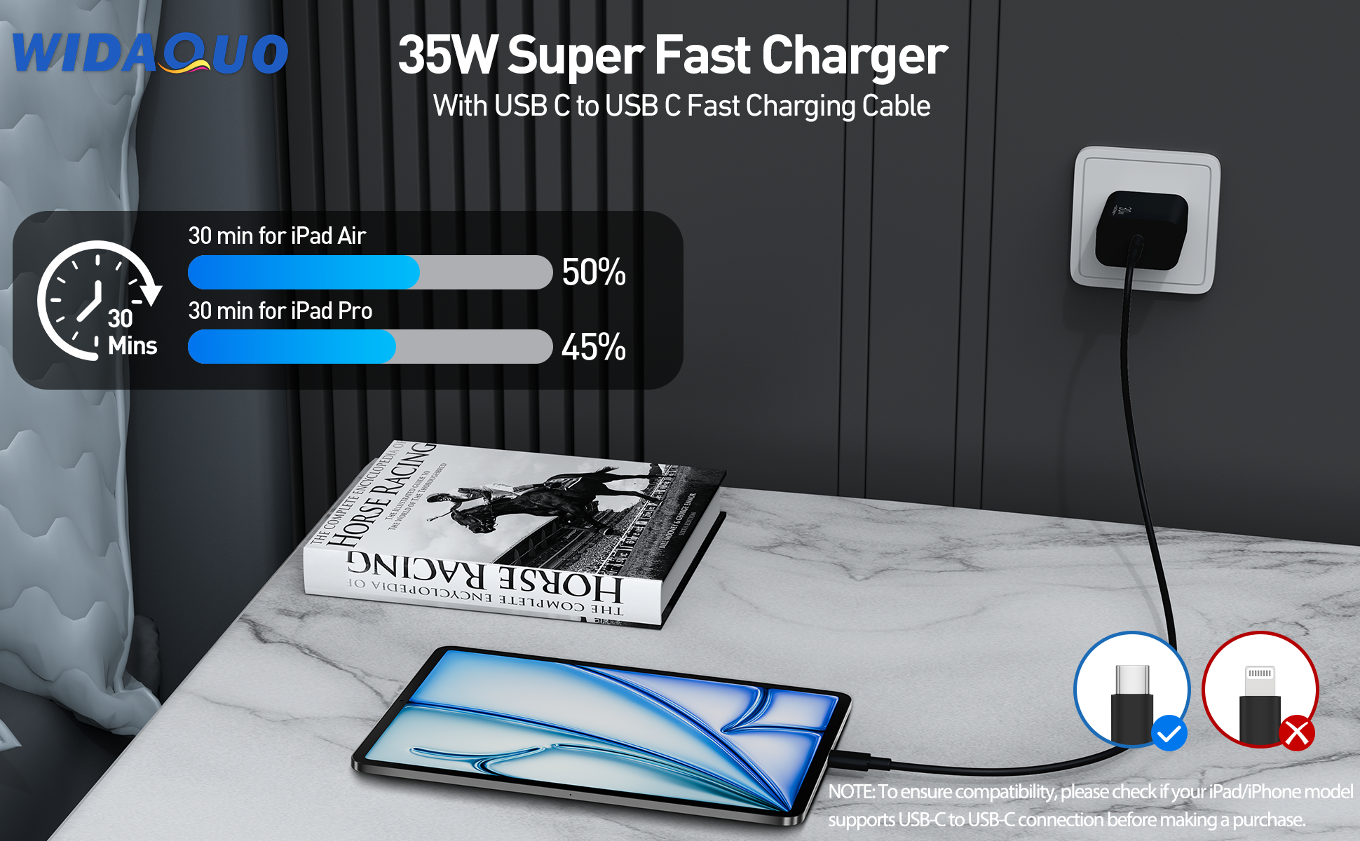 35W iPad Charger Fast Charging: Experience the powerful functions of PD 3.0 super fast charging technology with this 35W iPad USB C charger block. Charge for your iPad 10th up to 60% and iPhone 17 up to 70% in just 30 minutes, 5X faster charging speed and save you over 1.5 hour 6FT iPad Fast Charger Cord: The 6 foot USB-C to USB C charging cable enables you to charge for your iPad Pro device worry-free on the sofa, in the bedroom, in the office or on the go. Supports PD 3.0 fast charging up to 60W (3A/20V) and data sync transfer speed of 480Mbps Widely Compatibility: 35W Fast USB C fast charger specially designed for the iPad Series. Compatible with iPad Pro 13/12.9/11 inch 6th/5th/4th/3rd, iPad Air 13/11 inch M3 M2 Air 6th/5th, iPad Mini A17 Pro 2025 7th/6th, iPad 11th A16 2025 10th Generation, iPhone 17/17 Pro/17 Pro Max/Air/16/16 Plus/16 Pro/16 Pro Max/15/15 Pro/15 Pro Max, and also fast charge for Galaxy, Pixel, LG, Moto, Tablet, Android, and more USB-C devices. Note: This charger requires a USB-C to USB-C cable for connection. Please ensure your device has a USB-C port before purchase to avoid incompatibility. Safe Charging for iPad Pro: This 35W iPad Pro fast charger built-in smart IC chip that automatically identifies and matches the current required by the device to maximizing charging efficiency. Multiple protection systems to prevent over-charging and over-heating, ensuring the safety of connected devices What You Get: 1 x 35W Fast USB C wall charger Block, 1 x 6FT USB C to USB C Cable. If you have any issues, our professional and friendly customer service team will be keep online 24/7 and provide you with the suitable solutions