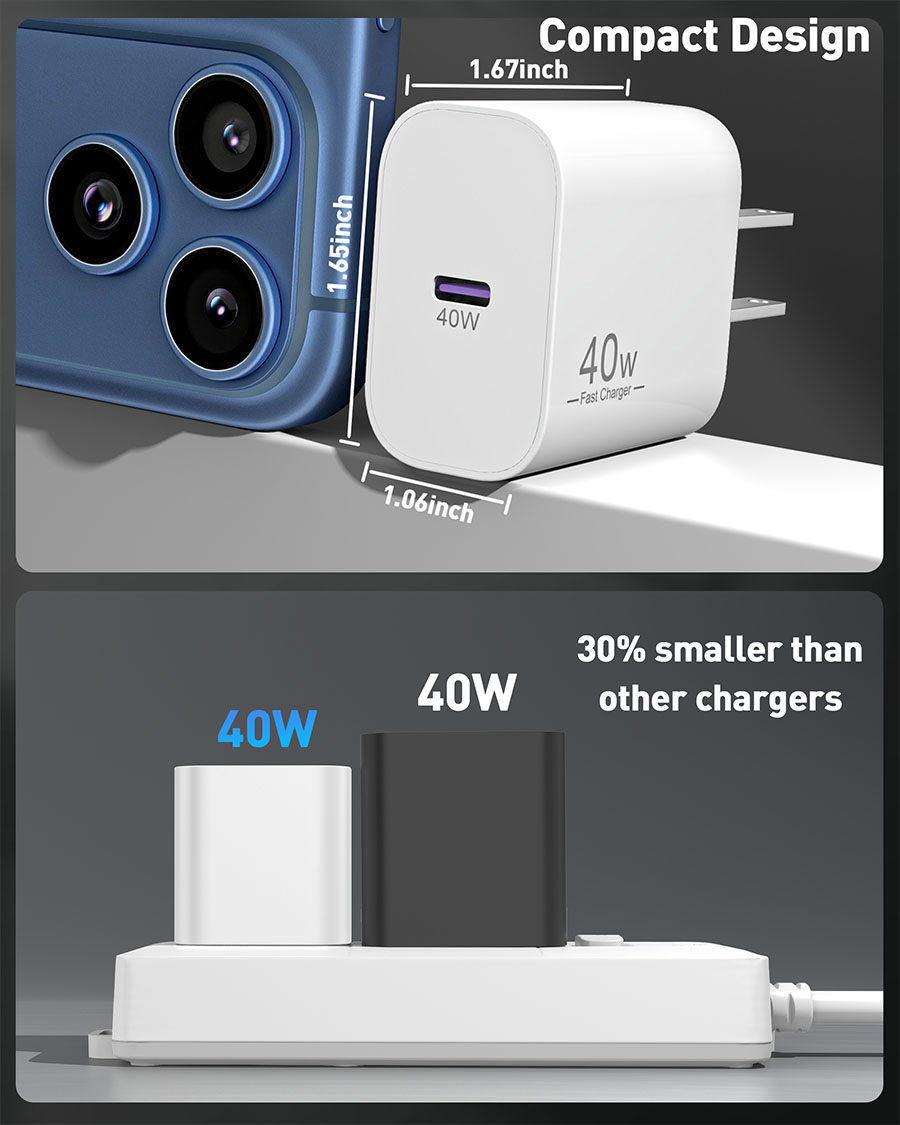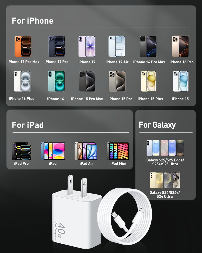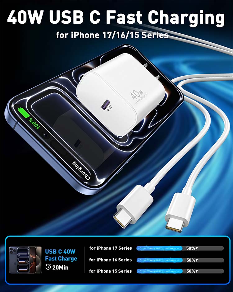 40W Fast Charging for iPhone 17/Air/16: The 40W USB-C port PD fast charger block and 6FT USB C to C fast charging cords, you can charge for your iPhone 17 16 Air up to 50% power in 30 minutes, and it takes 1.8 hours to fill, saving you 1.5 hours of time 60W 6FT Long iPhone 17 16 Charger Cord: This USB C charger cord support PD 3.0 fast charging up to 60W Max (20V/3A), compatible such as 20W/30W/40W/60W. The right USB-C plug is required and will charge your iPhone 17 16 from 0% to 88% in 35 minutes. 6Foot long length let you convenient to charge in bedroom, sofa, office, or even on the backseat of the car Universal Compatibility: 40W USB C fast charger block compatible with for iPhone 17 / 17 Pro/17 Pro Max, iPhone Air (2025), iPhone 16e / 16 / 16 Pro Max / 16 Plus / 16 Pro, iPhone 15 / 15 Pro Max /15 Plus/15 Pro, iPad Pro 13 inch (2024) /12.9 inch 6th/5th/4th/3th, iPad Pro 11 inch 4th/3th/2th/1th, iPad Air 5th, iPad Air 6th (2024)/5th/4th, iPad Mini 6th, iPad 10th Generation, and more USB-C devices Safe and Reliable: The 40W iPhone Air charger features a multi-functional safety system to ensure complete protection for your devices. USBC block built-in smart chip to automatically matches the current required by the device, automatically stop charging when the charge is full What Your Get: 2 x 40W USB C Power Adapter and 2 x 60W 6FT USB C to C Charge Cable (White). 18 months worry-free period and 24/7 customer service, if you have any questions, we will solve your issue within 24 hours