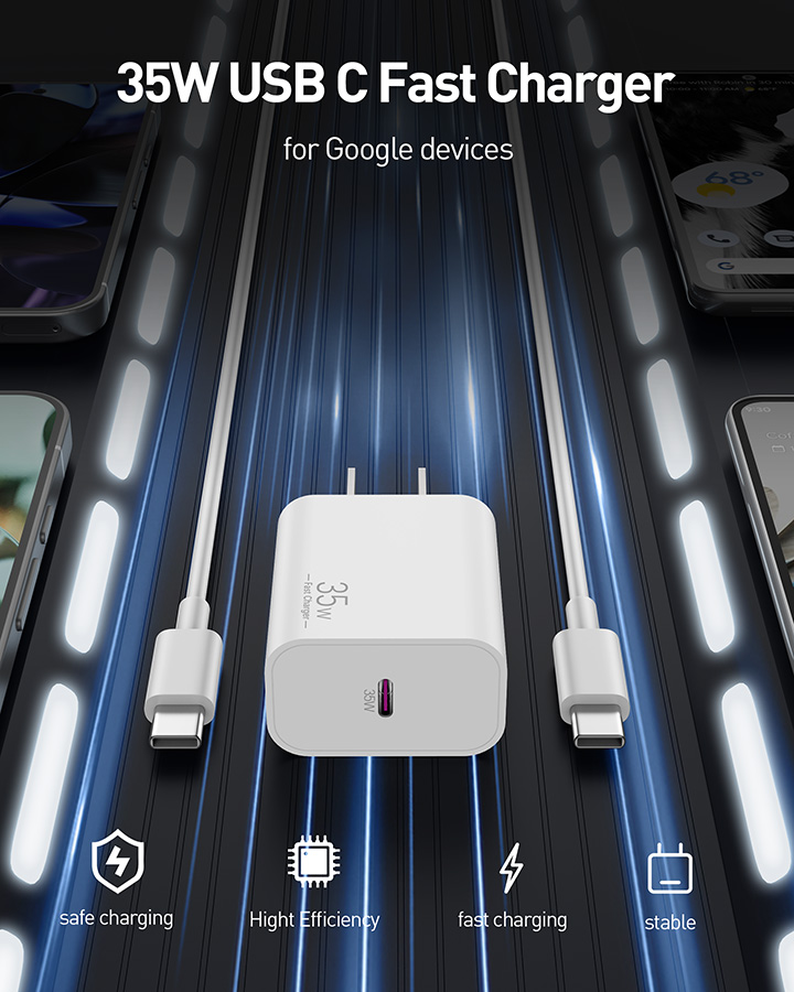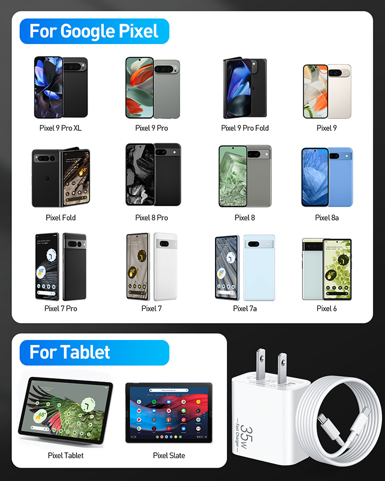 35W Fast Charging for Pixel 10: The Pixel 10 charger with experience the powerful functions of PD 3.0 super fast charging technology with this 35W USB-C charger block. Charge for your Pixel 10/9/8 up to 50% in just 30 minutes, 5X faster charging speed and save you over 1.5 hour, help you work efficiently 10FT Pixel 10 Pro Fold Charger Cord: The 10 foot long USB C to C cable enables you to charge your Pixel 10 Pro Fold device worry-free on the sofa, in the bedroom, in the office or on the go. Supports PD fast charging up to 60W (3A/20V) and data sync transfer speed of 480Mbps Widely Compatibility: 35W Fast charger for Google Pixel 10/10 Pro/10 Pro Fold/10 Pro XL/9/9 Pro/9 Pro Fold/9 Pro XL/8a/8/8 Pro/7/7a/7 Pro/6/6a/6 Pro/5/4 XL, Pixel C Tab, Google Chromebook Pixel, iPhone 17/ 16/15 Series, Galaxy, Moto, Tablet, Android Phone, and more Safe and Reliable: This Pixel 10 charger built-in smart IC chip that automatically identifies and matches the current required by the device to maximizing charging efficiency. Multiple protection systems to prevent over-charging and over-heating, ensuring the safety of connected devices What You Get: 2 x 35W USB C Power Adapter, 2 x 10FT Long USB C to USB C Cable. 12-Month Replacement. If you have any issues, our professional and friendly customer service team will be keep online 24/7 and provide you with the suitable solutions