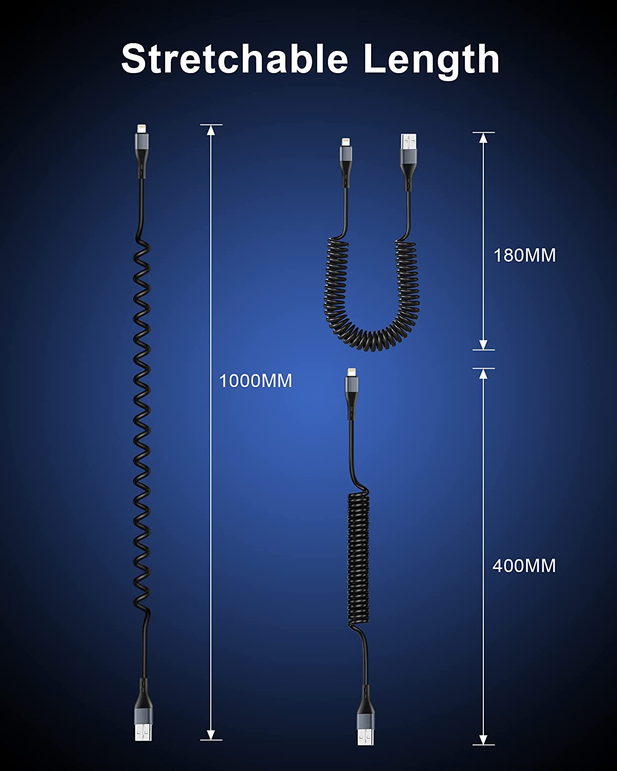 【Coiled Lightning Cable for Car】 3FT short coiled iPhone cable (tensile length: 0.9FT-3FT) Stretch it as long as you need (Max 3FT) and easy bounce back to normal length (0.9FT); It can well save the use of space, Perfect choice for use in the car. 【Less Mess and Portable】Coiled iPhone Cable perfect short cable solution, easy to store or carry, Ideal use in the car / with powerbank / for travel or daily use, portable and tangle-free, say goodbye to the hassle of USB cable clutter and tangles. 【MFi Certified & CarPlay Supported】Retractable iPhone Charger Cable fully support CarPlay, Provide max current up to 3Amp and 480Mbps high transmission speed, MFi certification ensures wide compatibility for your iPhone or iPad/iPods/AirPods. no error message popping up. 【Wide Compatibility】Compatible with all lightning IOS products, such for iPhone 14/14 Plus/14 Pro Max, iPhone 13/12/11/Pro Max/Mini, iPhone XS/XR/X/SE, iPhone 8/7/6/Plus. Also compatible with iPad/iPods and AirPods. 【What You Get】 3Pack 3FT Coiled USB-A to Lightning Cable. 2-Years worry-free replacement, 24 Hours friendly after-sales service.