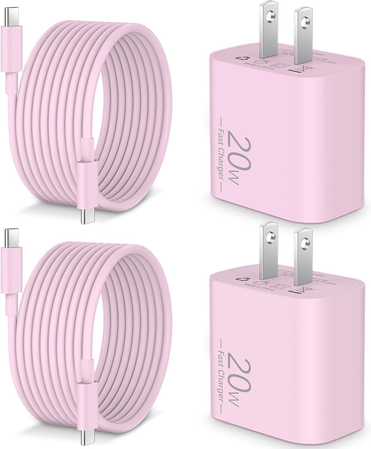 【USB C Fast Charger 】 With the 20W PD USB C Charger Block and 10FT long USB C to C cable, which can reach up to 3X faster than the standard 5W charger. You can charge for iPhone 15 from 0%-60% in about 30-Minis. 【Universal Compatibility】 20W USB C Fast Charger Compatible with most USB-C devices, including for iPhone 15/15 Plus/Pro Max, iPad Pro 12.9 inch 6th/5th/4th/3th (2022/2021/2020/2018), iPad Pro 11 inch 4th/3th/2th/1th (2022/2021/2020/2018), iPad Air 5th (2022), iPad Air 4th (2020), iPad Mini 6th Gen (2021), iPad 10th Generation 10.9 inch (2022); Also compatible with Google Pixel 7/6/5/4/3/2/XL, and more USB C android phones. 【60W 10FT USB C Cable】 USB-C to USB-C Charging Cable supports PD 3.0 fast charging speed max up to 20V/3A (60W), also support 480Mbps Sync/Data transfer speed; and the 10-Foot length long enough to be convenient to charge your device in bedroom, sofa, office. 【Safe & Reliable】 The upgraded Type C fast charger kit built-in multiple protection systems to avoid over-voltage, over-charge, over-heating; The iPad air charger iPad mini charger can automatically match the current required by your devices to charge your devices quickly, safely and stably. 【What Your Get】 2-Pack 20W USB C Wall Charger Block Power Adapter and 2-Pack 10FT USB C Charger Cord (Pink)
